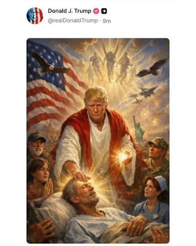 Chez Donald Trump, la même idée, la même lecture, la même instantanéité, la même brutalité, la même violence car la politique est un rapport de forces. Dans le même mouvement, une image générée par intelligence artificielle — le représentant en Jésus-Christ — a circulé puis été retirée de ses réseaux. Intense, abyssal ! Que devient le sacré ? Alors Trump a-t-il songé à Napoléon qui, le premier, n’a pas voulu se laisser dicter par la légitimité religieuse du Vatican. Dans un geste célèbre, il prendra la couronne des mains du pape Pie VII pour se la poser lui-même. Ce moment est esquissé et  immortalisé par Jacques-Louis David dans Le Sacre de Napoléon. C’est pour les historiens, l’un des basculements les plus puissants de la modernité politique. Napoléon parachève l’idée des Lumières. Le sacré n’est plus politique. Le tableau de David est une leçon. Il nous interroge sur la durée des hommes, des empires et des nations. : « Pour un temps nécessairement bref » selon Olivier Battistini. A la différence chez Trump qui efface son image numérique alors qu’elle n’était que flux et donc destinée à se noyer, à disparaître dans l’univers virtuel.